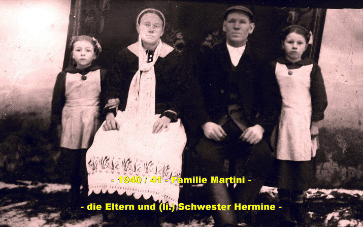 Ehepaar Martini Johann (*03.03.1878 +27.06.1969) stammt von Hof Nr. 7 Ehefrau Hermine geborene Gunnesch (*02.04.1882 +21.03.1932) Sohn Johann (*21.05.1905) bleibt auf diesem Hof Tochter Hermine (*04.06.1913) heiratet auf Nr. 64 Wonner Tochter Maria (*04.06.1913) Tochter Emilie (*23.07.1923)