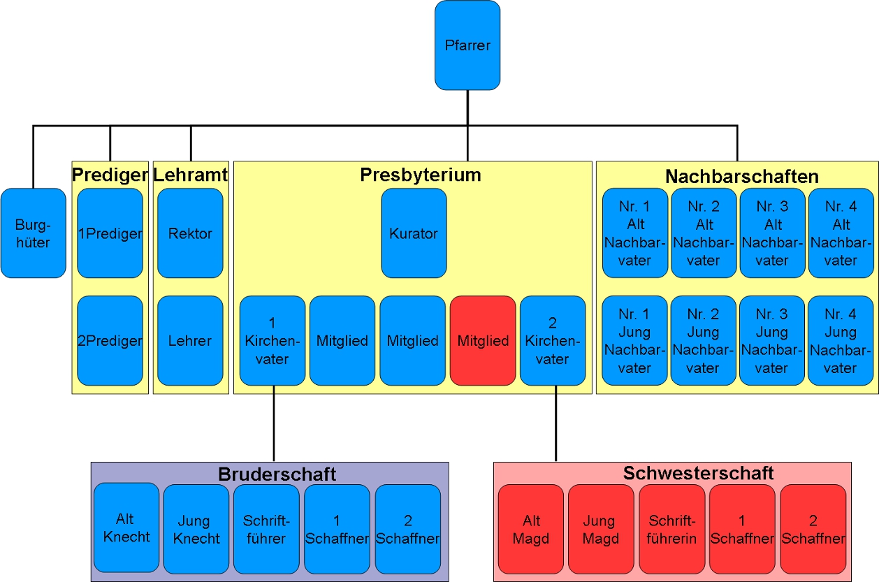 Bis zum Zweiten Weltkrieg bestand das Presbyterium aus zwölf Mitgliedern, danach wurde es auf fünf reduziert. Die Bevölkerung war geschrumpft. Es musste mindestens eine Dame unter den Mitgliedern sein. In den 1950-ger Jahren wurde als erste Frau Emilie Schöffend Nr. 82 ins Presbyterium gewählt.